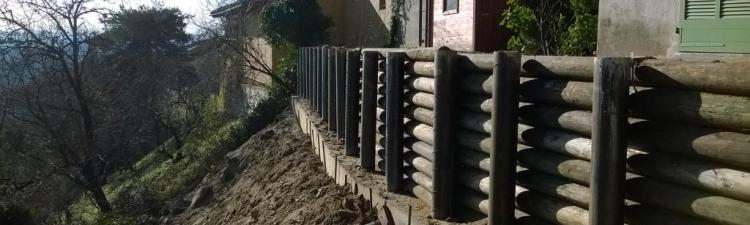 Realizzazione di palizzate per contenimento terreno con l'utilizzo di tubi in acciaio e pali in legno trattati. Il sistema combina la tecnologia di consolidamento con pali e/o micropali in acciaio e cemento armato, con la naturale bellezza del legno. Si ottiene il risultato di un consolidamento stabile nel tempo e un minore impatto ambientale, in quanto alla vista, si nota solo il legno dei pali e i tubi in elevazione che hanno la possibilità di essere ulteriormente mascherati, con vernici di vario colore o con rivestimenti in legno.